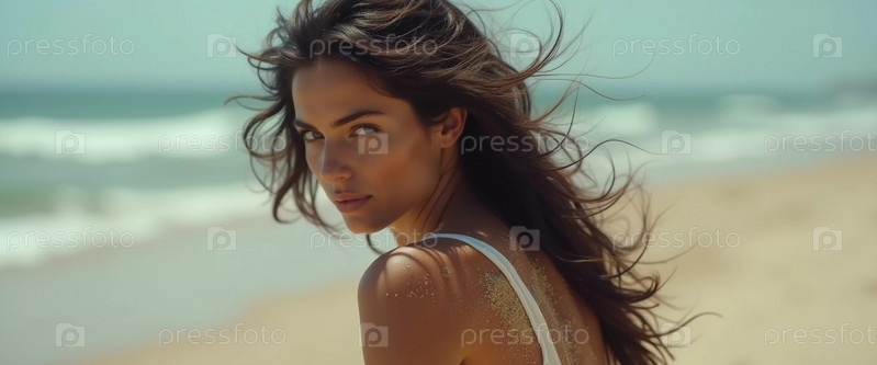Брюнетка в купальнике смотрит назад, стоя возле береговой линии. Нежные морские волны обнимают ее у ног под чистым голубым небом. Длинные волосы, красивое молодое лицо. Путешествия и реклама одежды