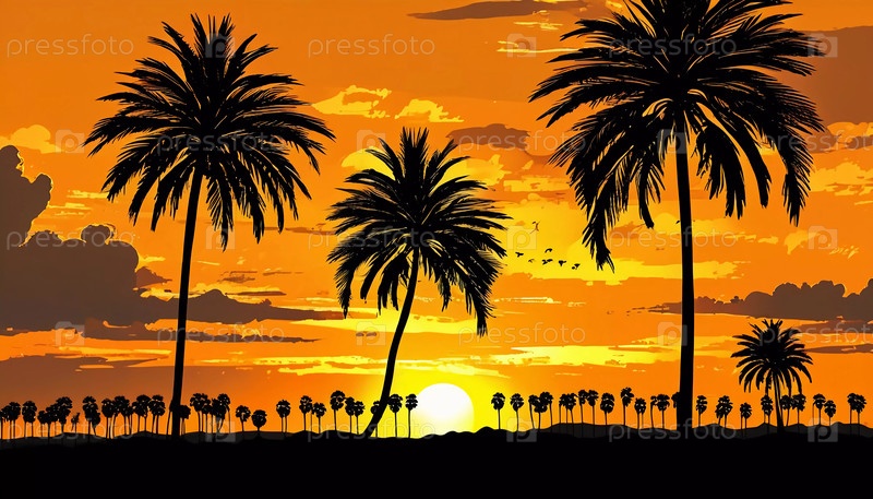 Когда солнце опускается ниже горизонта, пальмы создают длинные силуэты на холсте огненных цветов Generative AI