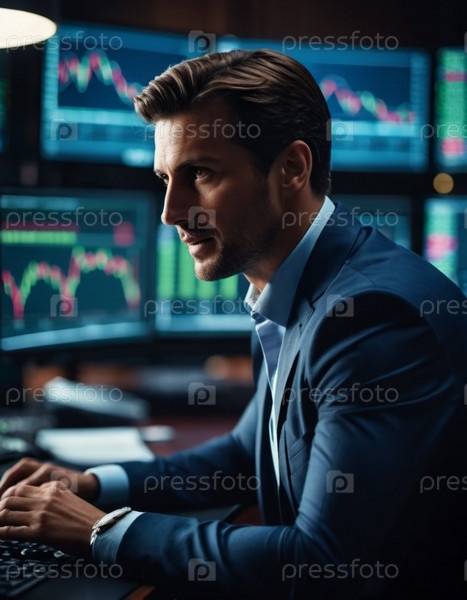 Трейдер, ориентированный на цифровой финансовый анализ сидит за компьютером в элегантном торговом зале, заполненном экранами, отображающими рыночные тенденции и данные