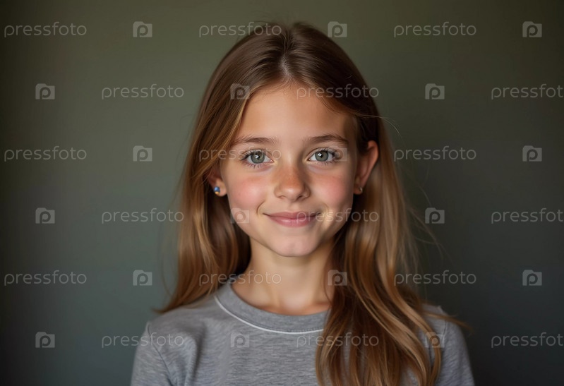 Молодая белая девушка с красивыми глазами и волнистыми волосами стоит, мягко улыбаясь.Ее игривое поведение просветляется, когда она позирует в уютном помещении во Франции.Генеративный ИИ