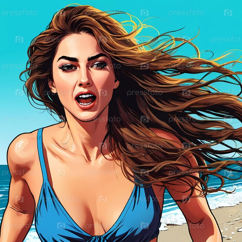 Женщина наслаждается оживленным днем на пляже, бегая вдоль береговой линии в купальнике, ее длинные волосы свободно текут в океаническом бризе, а волны мягко обнимают ее ноги