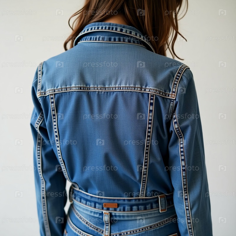 Женщина в шикарном джинсовом куртке изображена сзади, подчеркивая сложные швы и современный дизайн.Этот модный наряд иллюстрирует городской стиль, идеально подходящий для повседневных выездов
