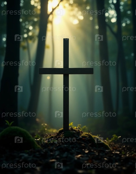 Солнечный свет проникает сквозь плотный навес деревьев, создавая завораживающие лучи, которые освещают одинокий деревянный крест, расположенный в лесу