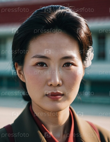 Женщина средних лет из Северной Кореи стоит на улице, ее серьезное выражение лица отражает окружающую среду.Она одета в традиционную одежду, а за фоном видна толпа