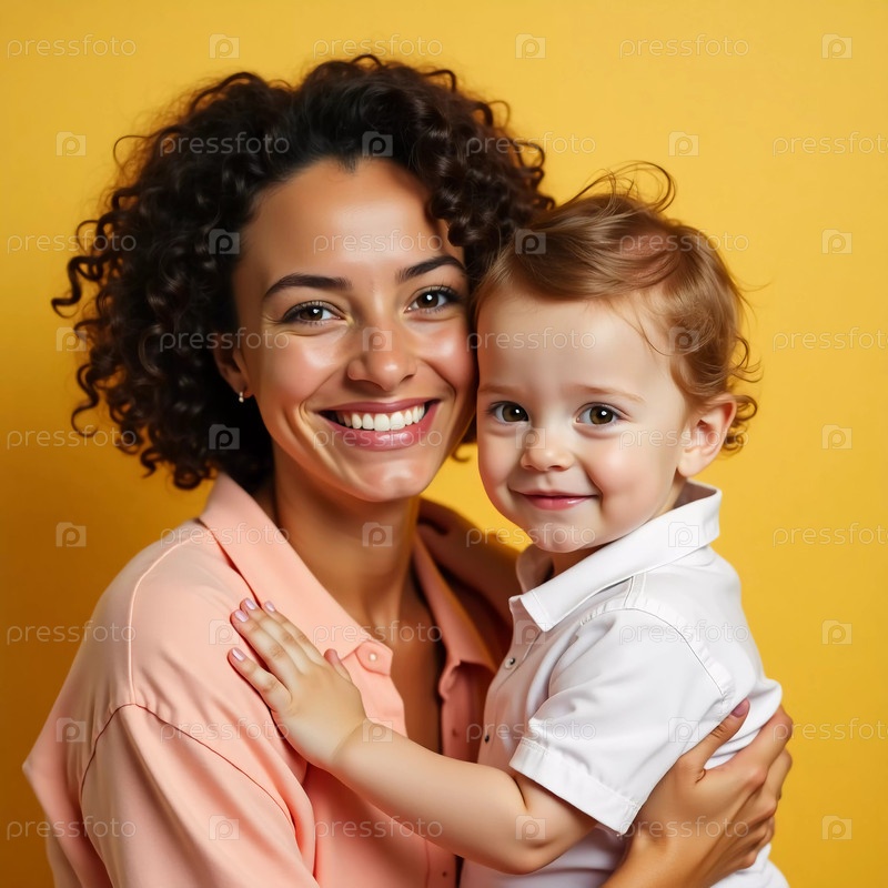 Мать держит своего веселого ребенка рядом, оба вспыхивают от радости и тепла на ярком желтом фоне, который излучает счастье и комфорт