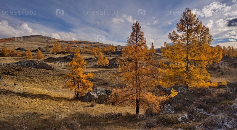 Россия. Юг Западной Сибири, горный Алтай. Глубокая осень в Курайской степи на живописных каменистых россыпях в окружении желтых лиственниц вдоль Чуйского тракта