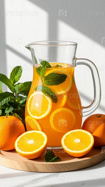 Апельсиновый домашний лимонад с мятой. Апельсины со стаканом и кувшином вкусного сока на светлом фоне