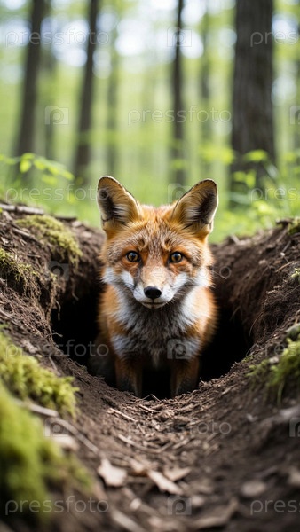 Рыжая лиса возле норы. Молодая лисица выглядывает из норы