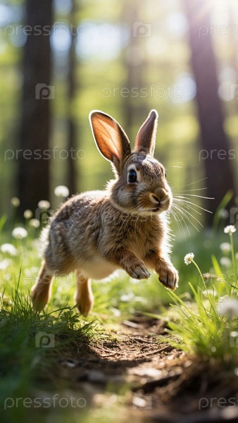 Заяц прыгает в лесу. Кролик скачет в зеленой траве. Дикий детеныш кролика, прячущийся в лесу. Заяц крупным планом на фоне леса