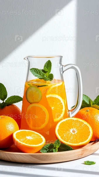 Апельсиновый домашний лимонад с мятой. Апельсины со стаканом и кувшином вкусного сока на светлом фоне