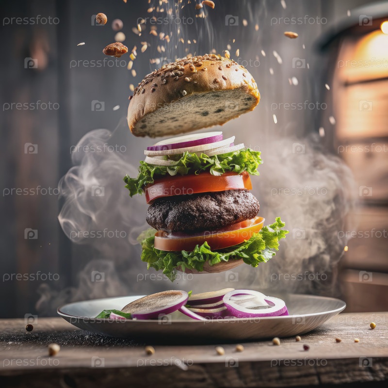 Вкусно сконструированный бургер, подвешенный в воздухе с ингредиентами, плавающими вокруг него
