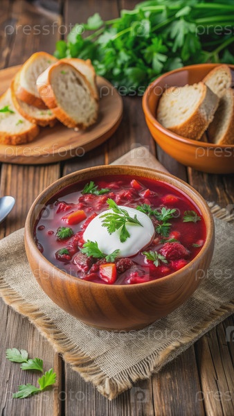 Традиционный украинский борщ с кислой смесью и зелень, подаваемая с хлебом