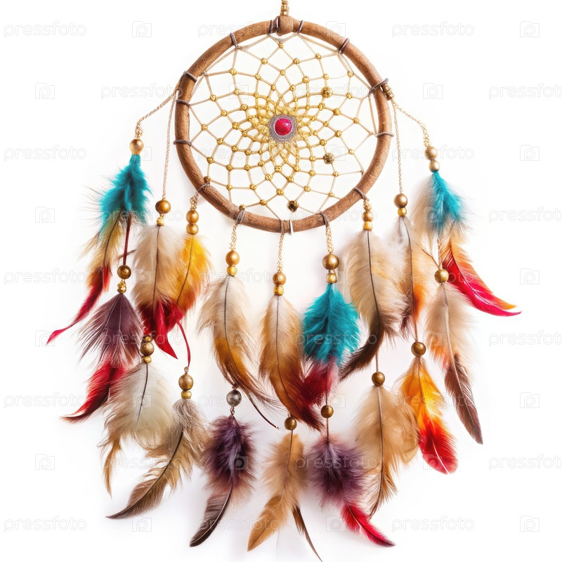 Красочный ловец сновидений с перьями и бусинами на белом фоне