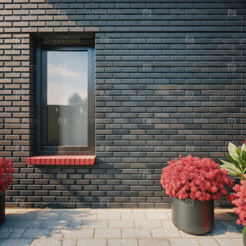 Черная кирпичная стена с окном и красными цветочными горшками спереди