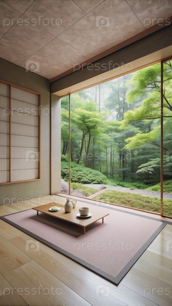 Современная японская чайная комната с большим окном и видом на лес