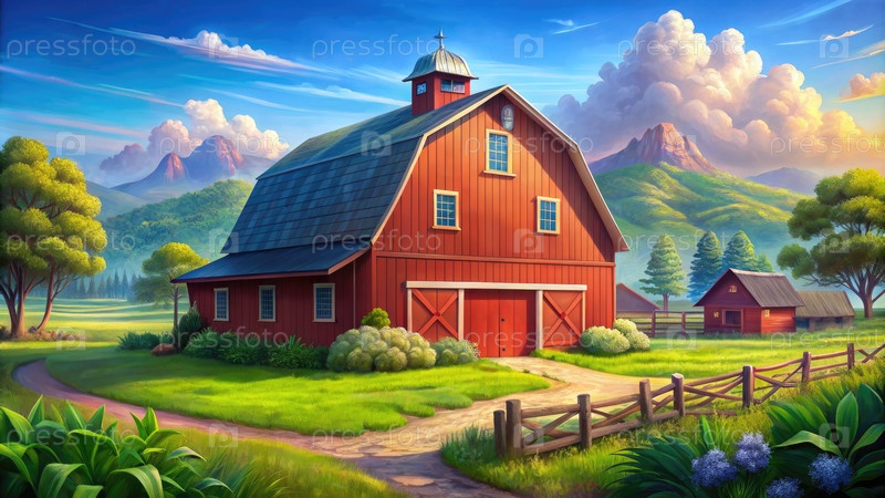 Сельскохозяйственный дом с красным сараем и пышными зелеными полями. генеративная ИИ