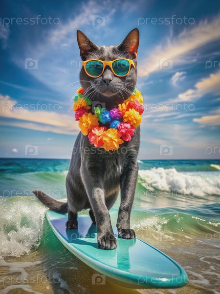 Крутой кот катается на серфе на солнечном пляже. Генеративный ИИ