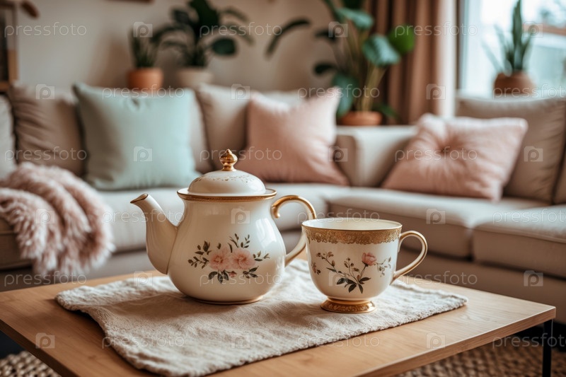 Стеклянная чашка чай на светлом фоне интерьер гостиной, напиток для ресторана меню