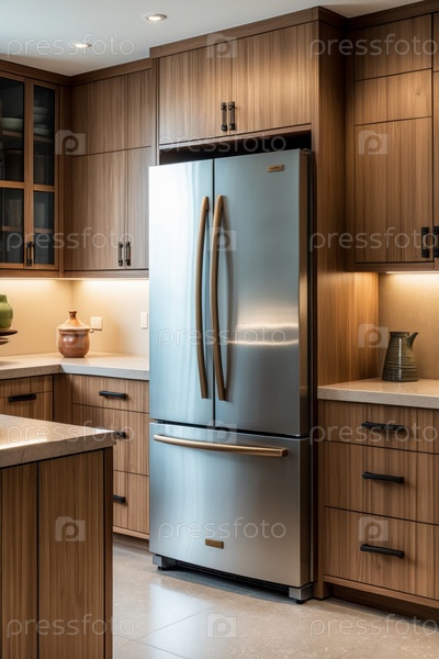 Современный стильный модный кухонный интерьер с деревянной мебелью и предметами домашнего обихода