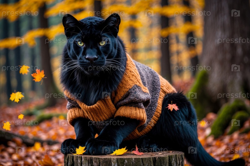 Пантера в трикотажном свитере на осеннем лесном фоне, животное в красно-желтой листьях