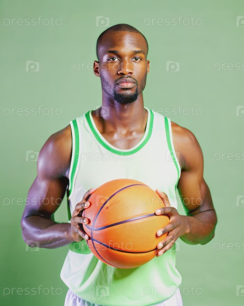 Баскетболист держит мяч на зеленом фоне