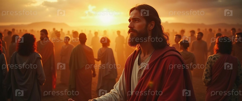 Иисус Христос стоит посреди многочисленного собрания, неся послание надежды и веры, в окружении внимательных последователей. Религия: христианство. Вера, надежда, любовь и мудрость. Генеративный ИИ