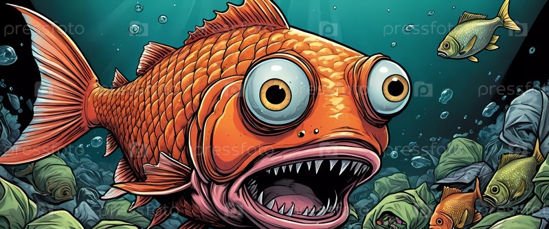 Большая рыба с преувеличенно выпученными глазами с ужасом реагирует, проплывая через загрязненную зону, заполненную выброшенным мусором, демонстрируя последствия загрязнения воды. Испуганная рыба с открытым ртом. Изображение создано с помощью ИИ