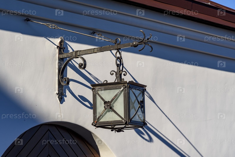 Старинный кованый фонарь на белой стене здания в Выборгском замке