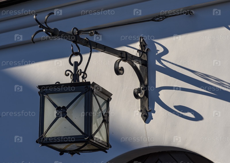 Старинный кованый фонарь на белой стене здания в Выборгском замке
