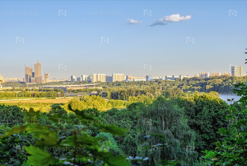 Вид на город с зеленой зоны, где видны деревья, кусты, река и городская застройка. Москва