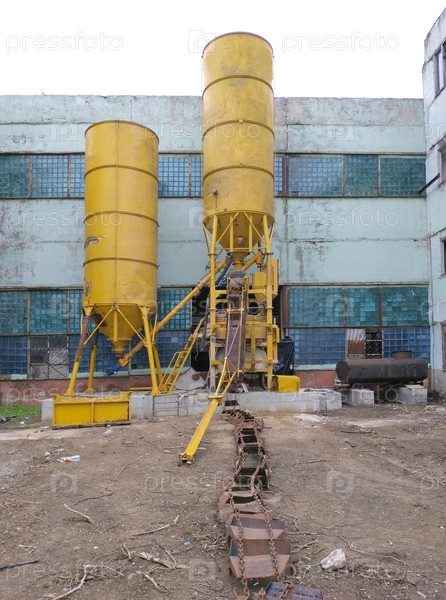 Два больших желтых контейнера на промышленном заводе. железная конвейерная лента растянута поблизости. заводские ремонтные работы