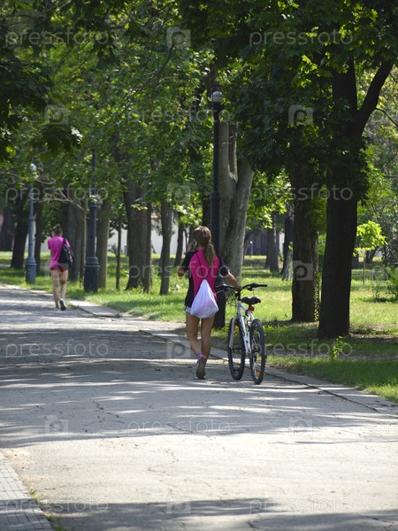 Красивая девушка идет по тропинке в парке и катит велосипед рядом