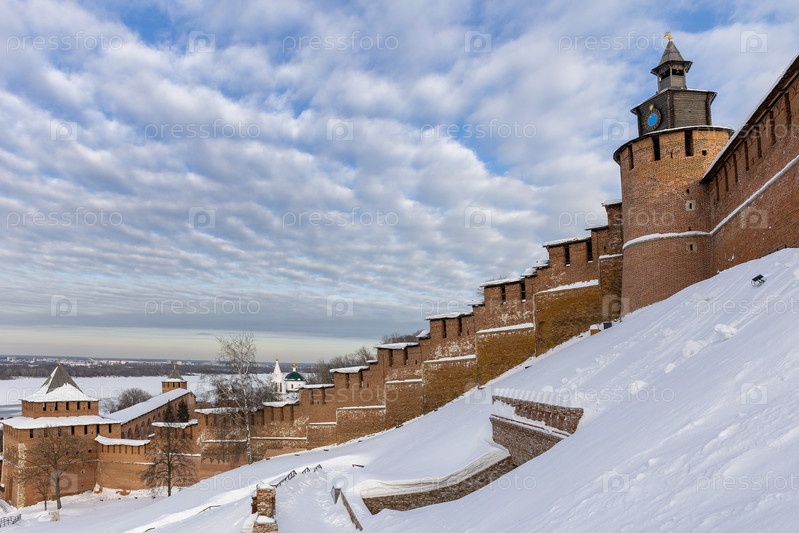 Россия. Нижний Новгород. Крепостная стена и башня Нижегородского кремля зимой