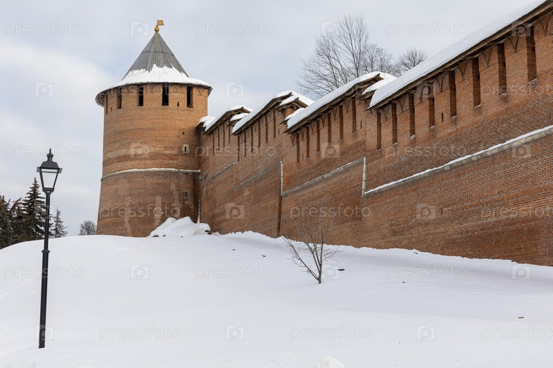 Россия. Нижний Новгород. Крепостная стена и башня Нижегородского кремля зимой