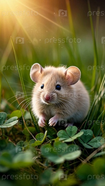 Полевка в зеленой траве. Милая мышь крупный план на поле с клевером