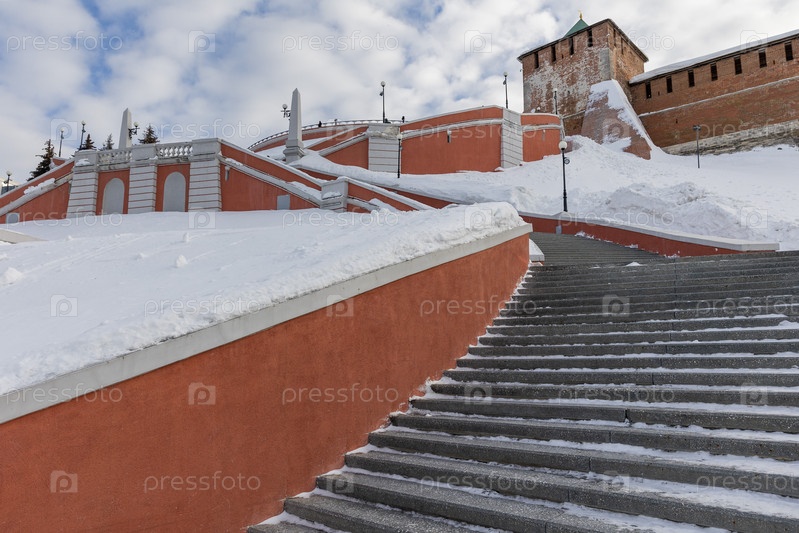 Россия. Нижний Новгород. Зимний вид на Чкаловскую лестницу и Нижегородский кремль