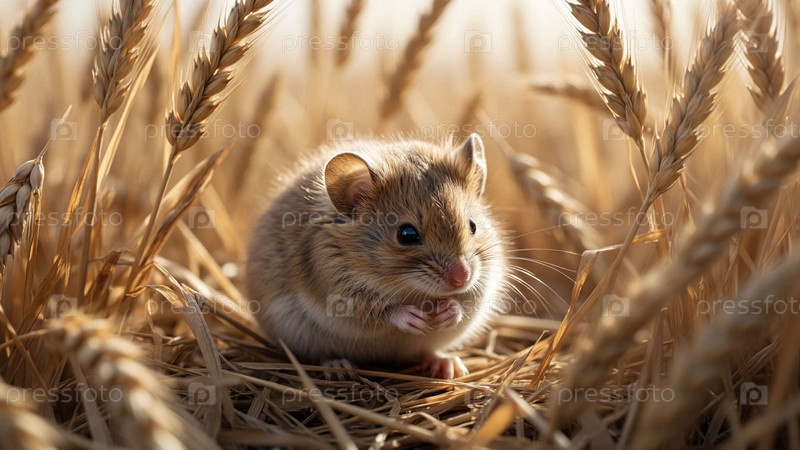 Полевка в траве. Контроль диких вредителей. Милая мышь на поле с пшеницей. Борьба с грызунами