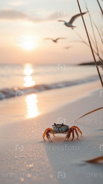 Маленький краб на пляже. Крабик на песчаном морском берегу крупный план. Чайки на море