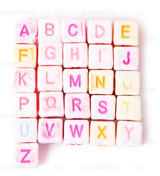 Розовые и желтые кубики букв, расположенные на белом фоне
