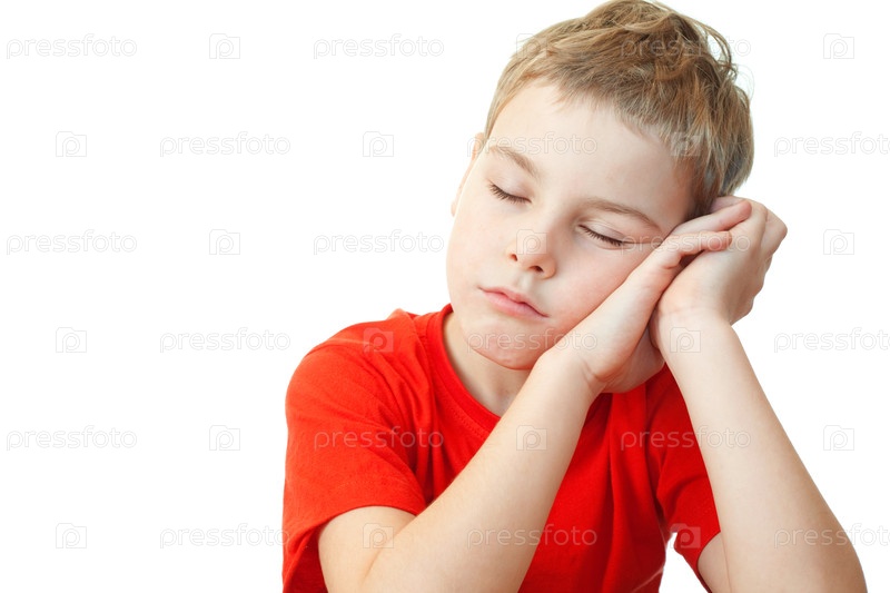 Молодой мальчик опирается головой на руки, глаза закрыты