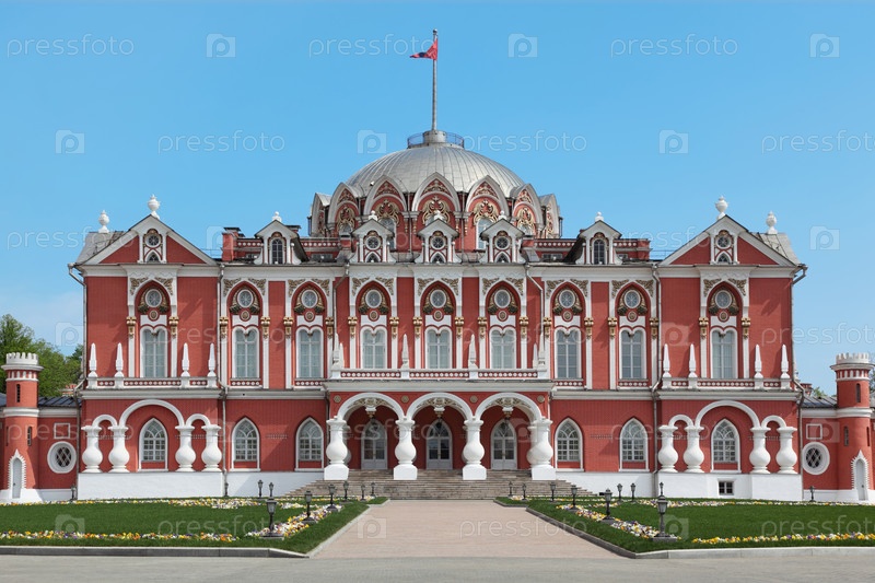 Большой красный кирпичный дворец с белой отделкой и куполом. Петровский путевой дворец в Москве