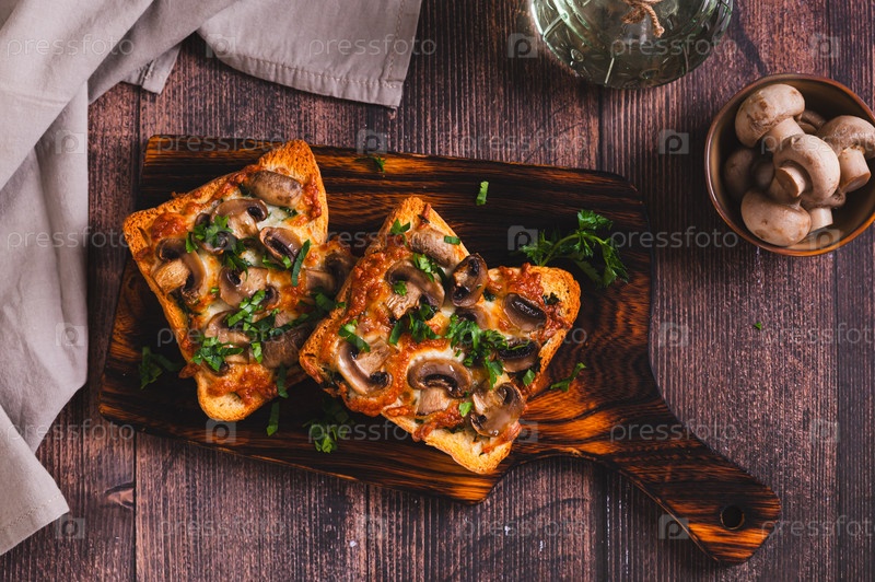 Вкусные выпеченные бутерброды с сыром, грибами и травами на доске вид сверху
