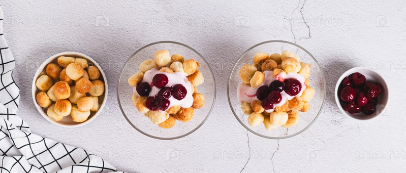 Вкусный хрустящий десерт с печеньем, йогуртом и ягодами в мисках