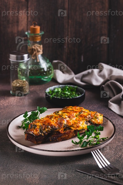 Свинское бедро выпечено с сыром, помидорами и грибами на тарелке на столе вертикальный вид