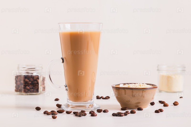 Протеиновый кофе в стакане и протеиновый порошок в миске на столе
