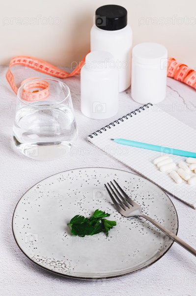 Концепция голода, диеты, снижения веса и вегетарианства на пустой тарелке (вертикальный вид)