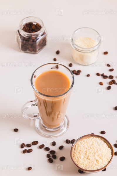 Протеиновый кофе в стакане и протеиновый порошок в миске на столе