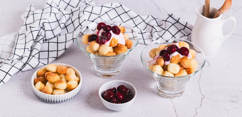 Небольшие круглые печенье, йогурт и вишневый варенье в мисках на столе веб-баннер