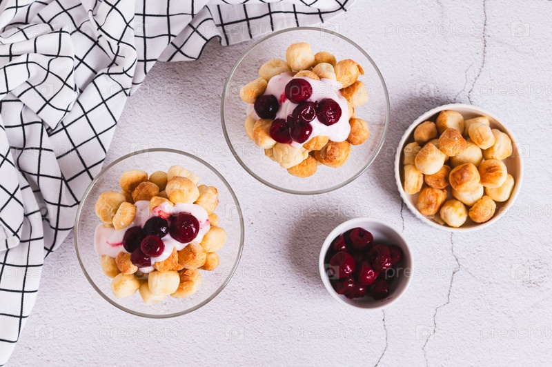 Небольшие круглые печенье, йогурт и вишневый варенье в мисках на столе