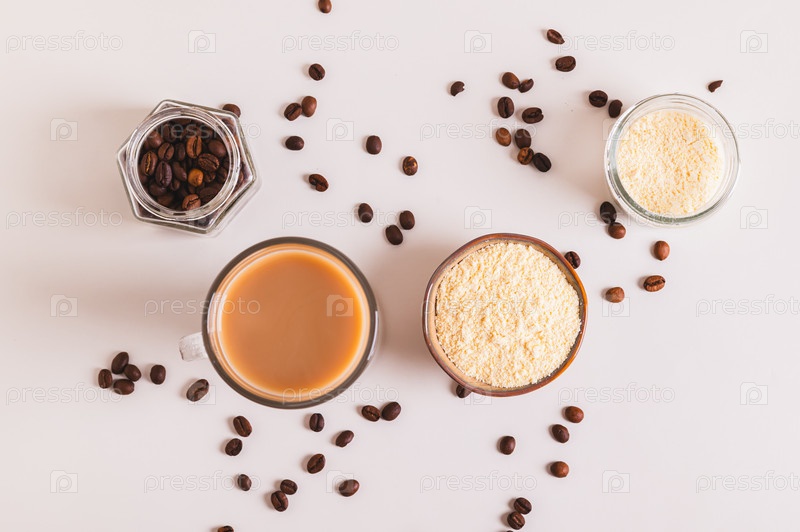 Белковый кофе в стакане и протеиновый порошок в миске на столе